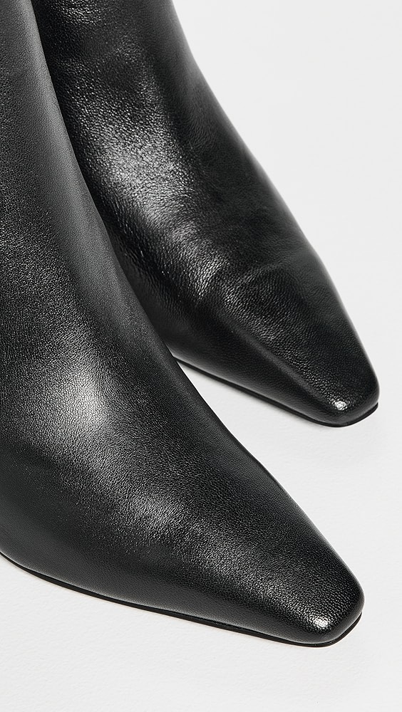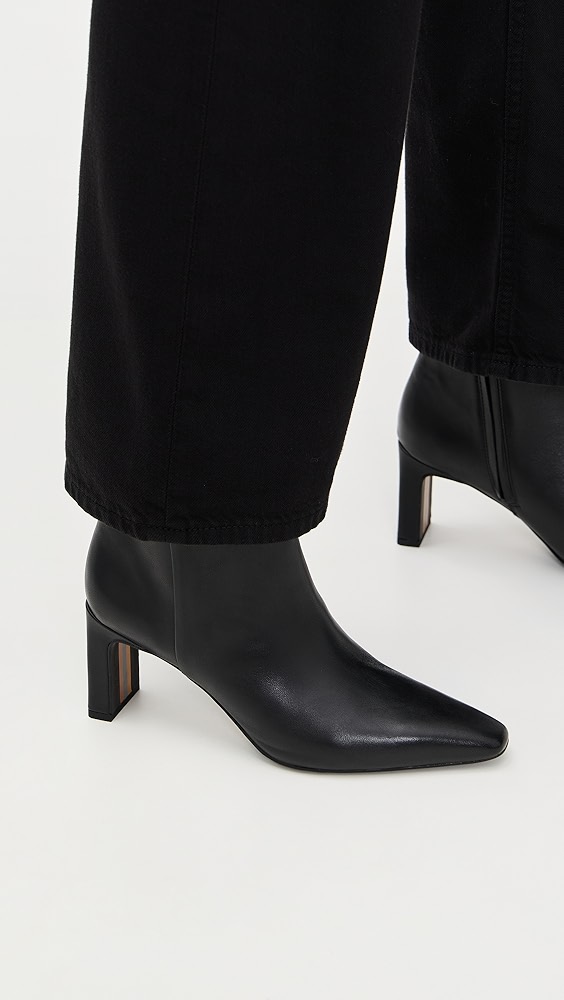 Upper: Sheepskin Lining: Leather Block heel Ankle zip Pointed toe Leather sole with rubber heel cap Imported, Vietnam This item cannot be gift-boxed Style #VINCE52974